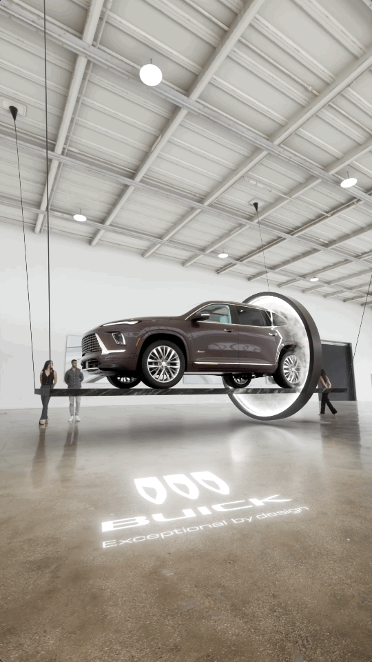 As we enter a large gallery space, we’re confronted with the Buick Enclave floating up on a pedestal suspended by cables along with a large ring positioned to pass through it.